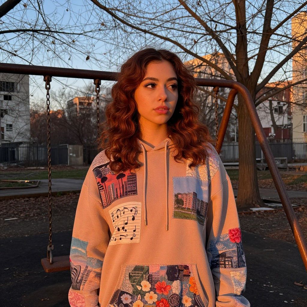 Photograph of a young woman with long, wavy brown hair standing in a park during sunset. She has a light olive skin tone and wears a beige hoodie with colorful urban-themed patches, including buildings and red flowers. The background features leafless trees, a metal swing with a chain, and apartment buildings. The lighting casts a warm, golden glow on her face and the hoodie, contrasting with the darker, cooler tones of the park and sky. The woman's expression is neutral, and she looks directly at the camera.