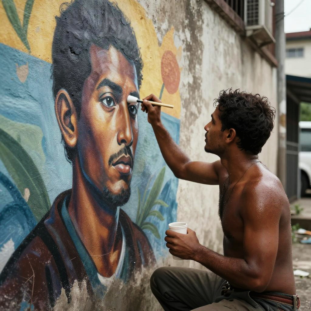 Homeless man drawing a mural on a weathered wall, blending colors with sweat and determination, urban grit meets artistic passion, cinematic perspective