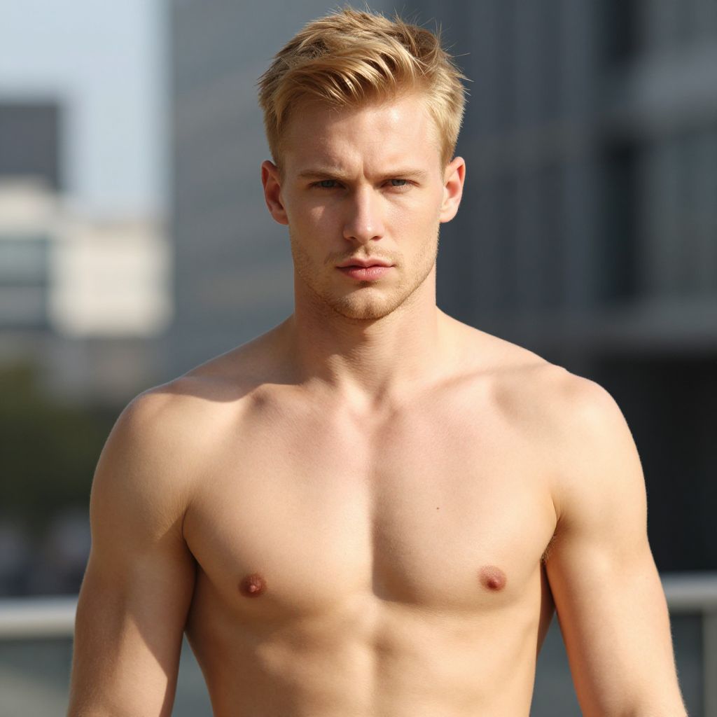 Photograph of a young, slim, Caucasian man with short, light brown hair and fair skin standing shirtless in front of a white-tiled wall. He has a slight tan, small, pink nipples, and a toned, muscular upper body with defined abs. The lighting is bright, casting soft shadows on his chest and arms. He has a serious expression with slightly parted lips and direct eye contact with the camera. The background is simple and minimalistic, focusing attention on the subject. The image has a high contrast and sharp detail.