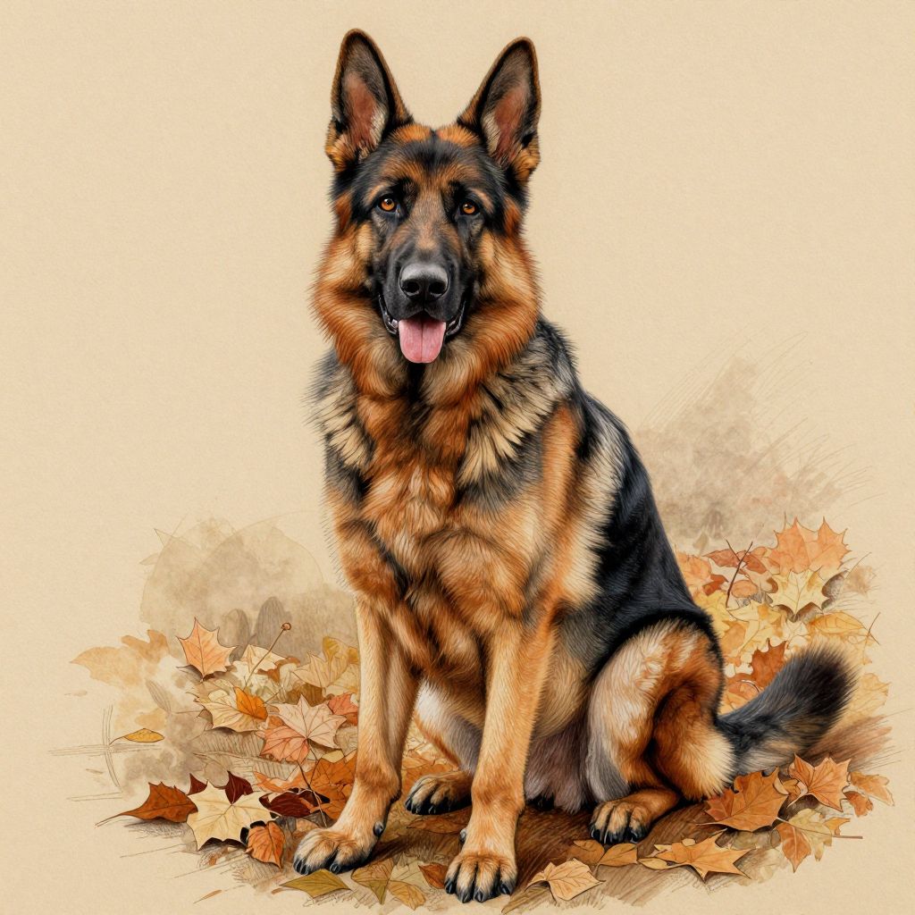 Dogdrawing depicting a noble German shepherd sitting proudly amidst autumn leaves, warm earthy tones, intricate detail in the fur and eyes, realistic pencil sketch with a touch of watercolor wash in the background