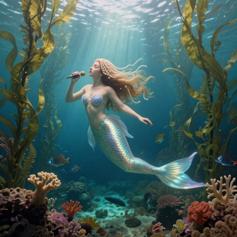 An enchanting underwater scene reminiscent of Renaissance oil paintings, depicting a majestic mermaid with hair like strands of pearls gracefully swimming through an enchanted kelp forest. Sunlight filters through the crystal-clear water from above, casting radiant beams that illuminate her translucent scales and shimmering tail, evoking a sense of awe and wonder. From an aerial perspective, focus on the intricate details of the coral reef and exotic sea creatures surrounding the mermaid as she serenely sings a haunting melody that echoes through the tranquil depths, inviting viewers to explore this captivating and otherworldly realm.