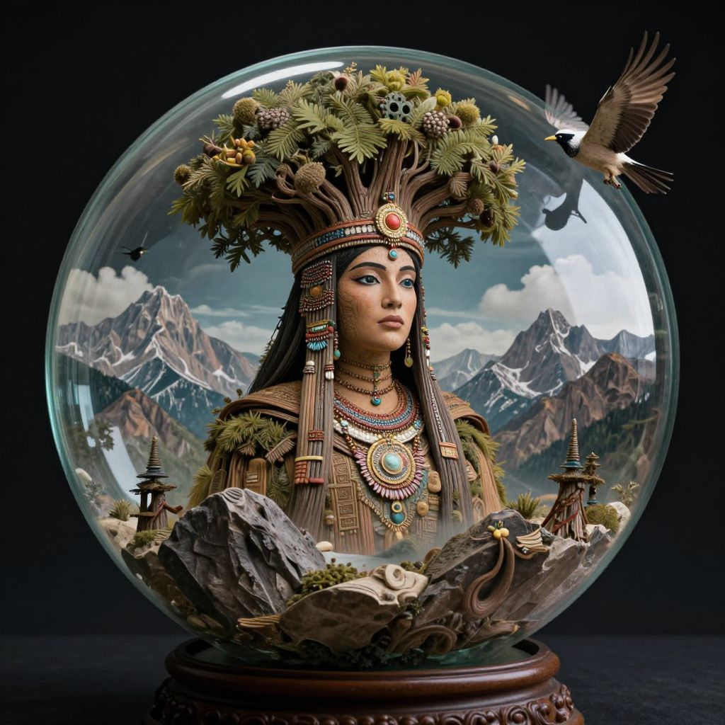 The image presents a highly detailed, photorealistic wood carving of a woman, likely inspired by Pocahontas, set within a circular composition. The carving is crafted from light wood, showcasing intricate textures and rough surfaces that add to its lifelike quality. The woman's face is adorned with elaborate patterns and a headband, surrounded by feathers and natural elements like leaves and branches, creating a harmonious blend of human and nature. Two birds, one on each side of her head, add a sense of motion and life to the scene. The circular frame encapsulates the carving, emphasizing its central position and the interplay of light and shadow that enhances the depth and realism of the artwork. The overall composition is balanced, with the woman's face at the center, flanked by the birds and natural elements, all bathed in cinematic lighting that highlights the textures and details of the carving.