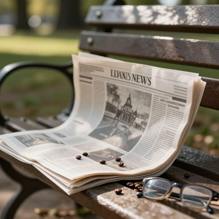 Photograph of a newspaper with black-and-white headlines and a bench photo, resting on a wooden park bench with glasses and coffee beans nearby, sunlight filtering