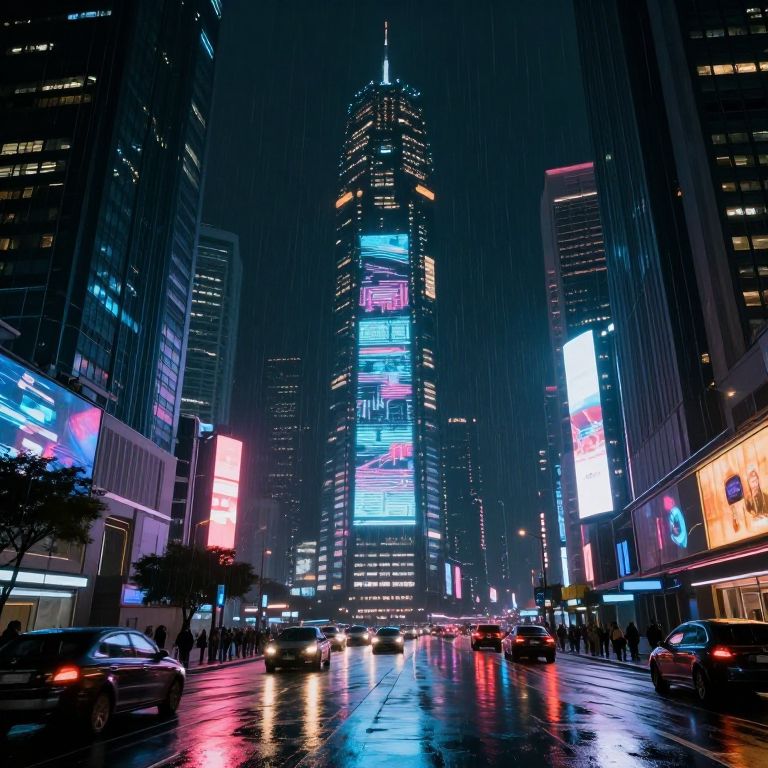 Photograph of a neon-lit, rainy urban night scene with a tall skyscraper in the center, surrounded by glowing billboards and reflections on wet