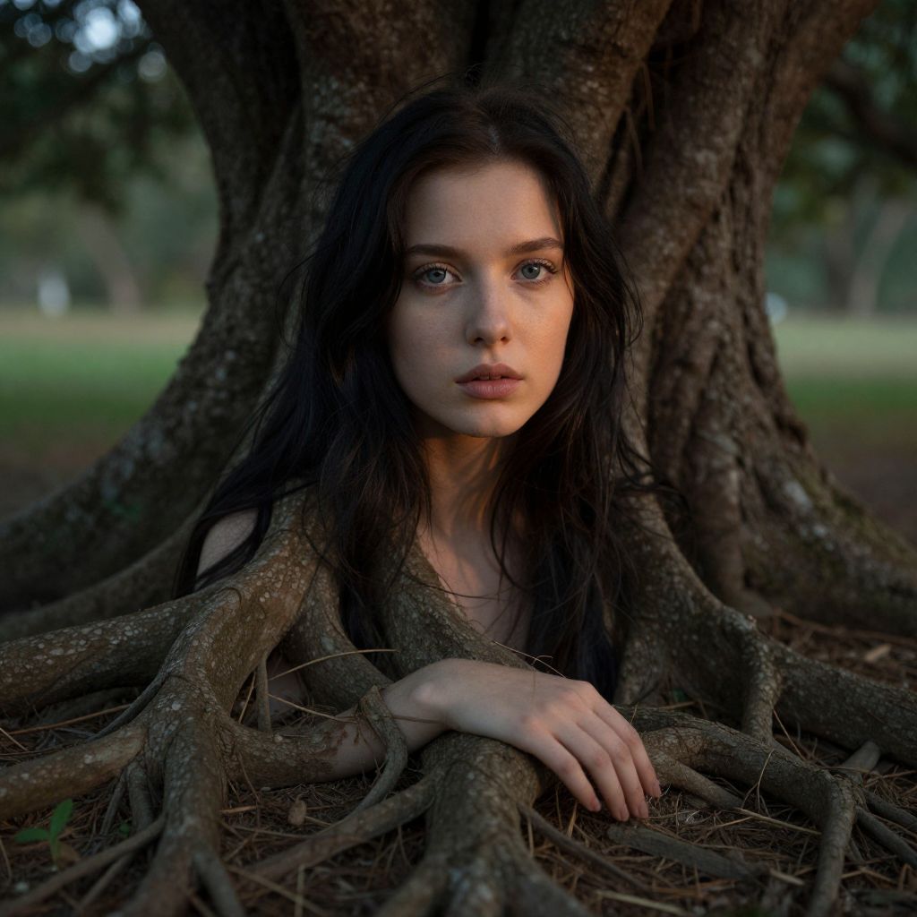 Photorealistic portrait of a young woman with long dark hair, blue eyes, and fair skin, leaning against a large tree with sprawling roots in a