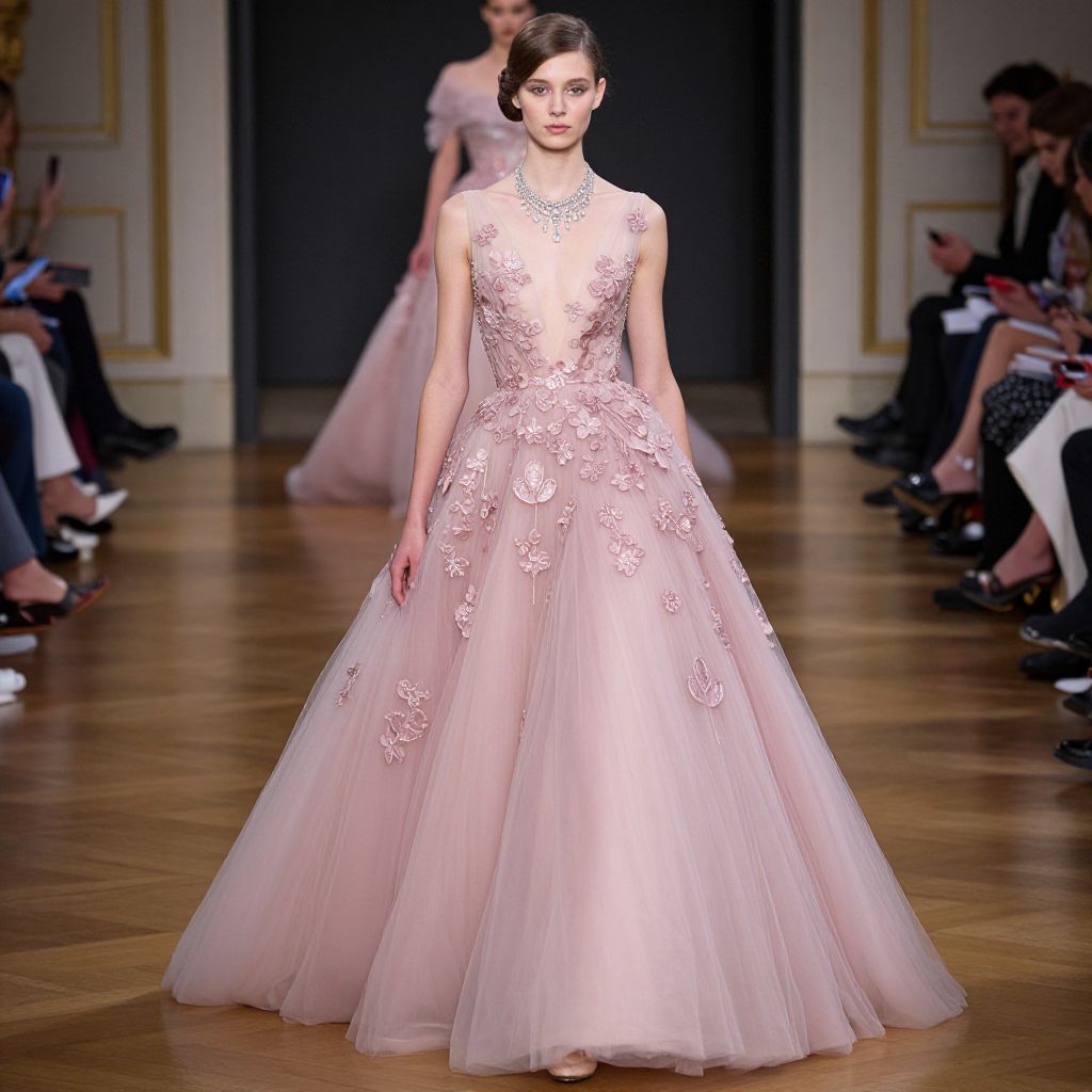 Stunningly elegant, the pink Lucille Ball gown from the Galia Lahav \"And God Created Woman\" haute couture fall 2018 collection showcases intricate embroidery cascading down its voluminous tulle skirt, complemented by a sheer bodice adorned with delicate floral appliqués and a sparkling necklace that accentuates the model's poised stance amidst a grand indoor setting.