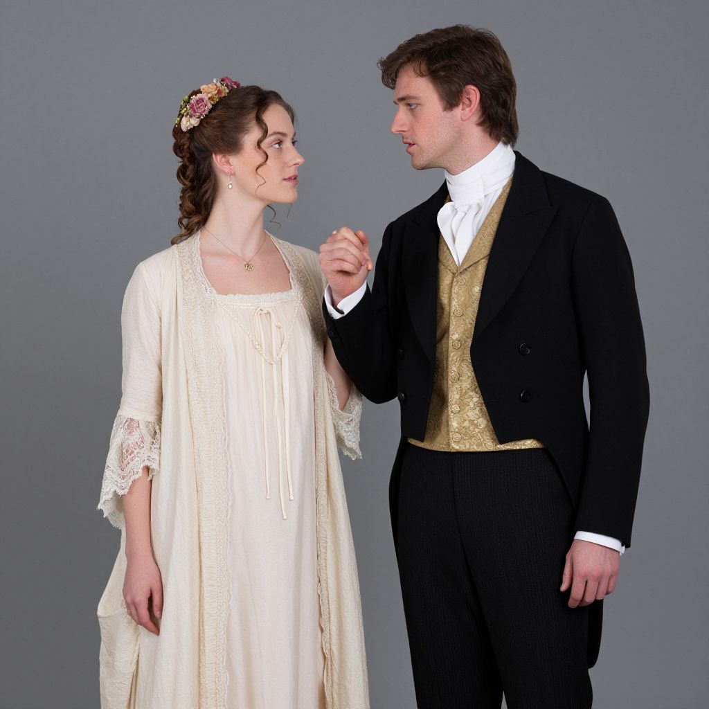 Actors dressed in period attire from *Sense and Sensibility* stand gracefully, with the woman wearing a cream-colored gown adorned with lace detailing and a floral headpiece, while the man dons a formal black suit with a gold vest and white cravat, both holding hands in an elegant pose.