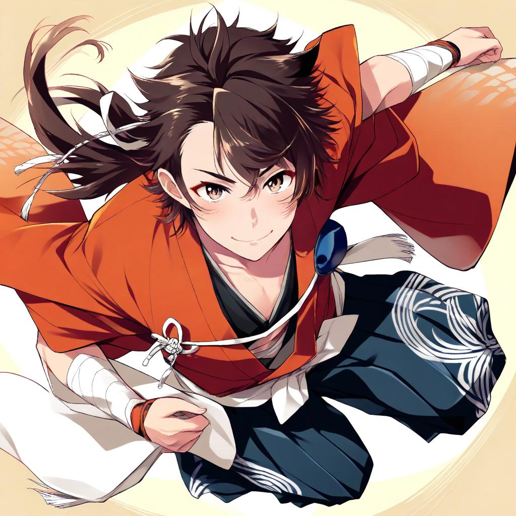Mutsu-no-kami yoshiyuki, touken ranbu, 1boy, yellow eyes, brown hair, long hair, japanese clothes, japanese clothes, sode, by artist kisairo kaede, animagine