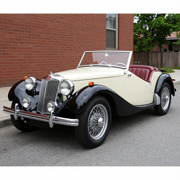 Photograph of a classic, cream-colored convertible car with black fenders and red leather seats, parked on a gray asphalt street. The car features a vintage grille, dual round headlamps, and chrome wire-spoked wheels. The background includes a red brick building with a window and a wooden fence with green foliage to the right. The car's windshield is rolled down, and the setting appears to be an urban neighborhood. The image has a slight HDR effect, enhancing the car's glossy finish and the texture of the brick wall.