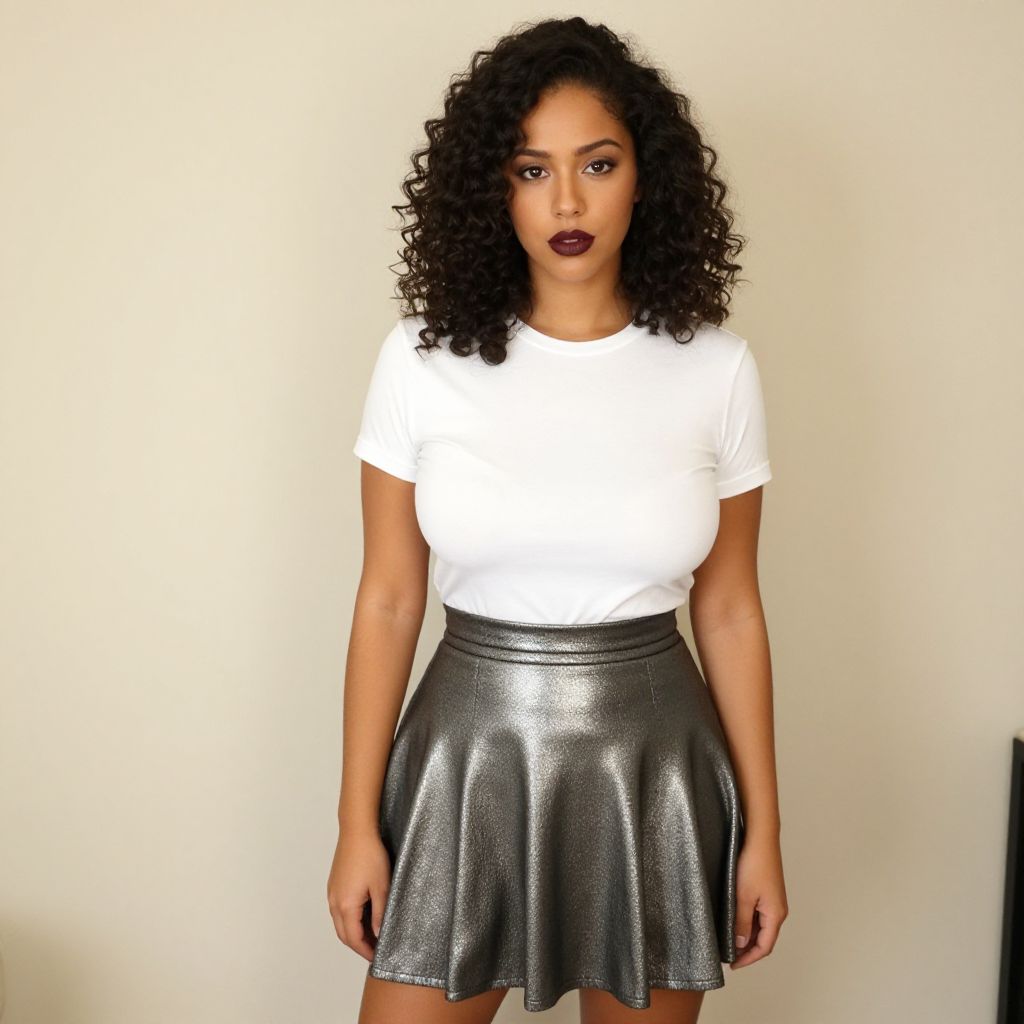 Photograph of a young woman with medium-dark skin and curly black hair standing against a plain white background. She wears a fitted white short-sleeve t-shirt and a high-waisted, metallic silver mini-skirt that shimmers under the light. Her dark red lipstick contrasts with her white top, and she has a neutral expression. The lighting is even, highlighting the texture of her skirt and the simplicity of her outfit. The image is sharply focused and centered on her, with no additional objects or distractions in the background.