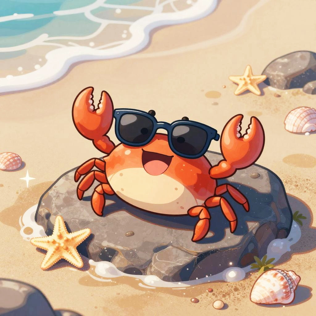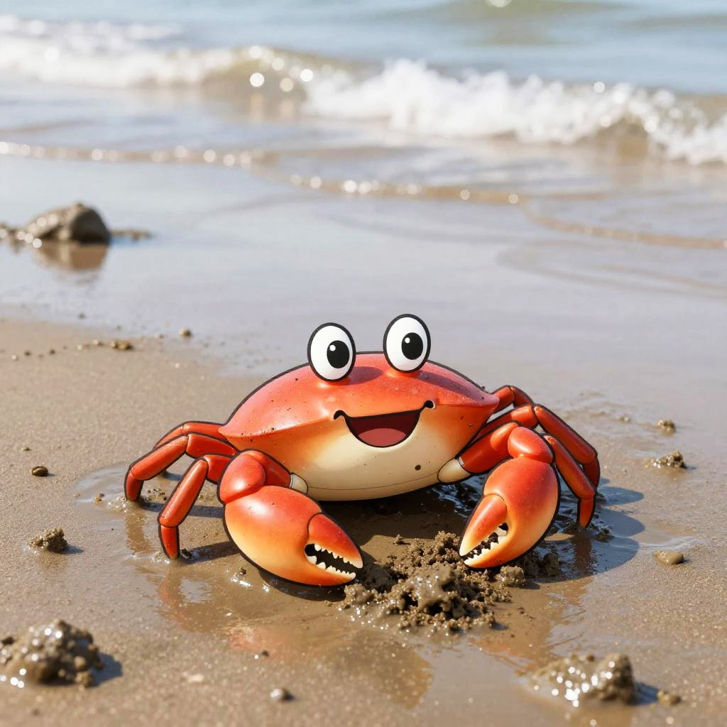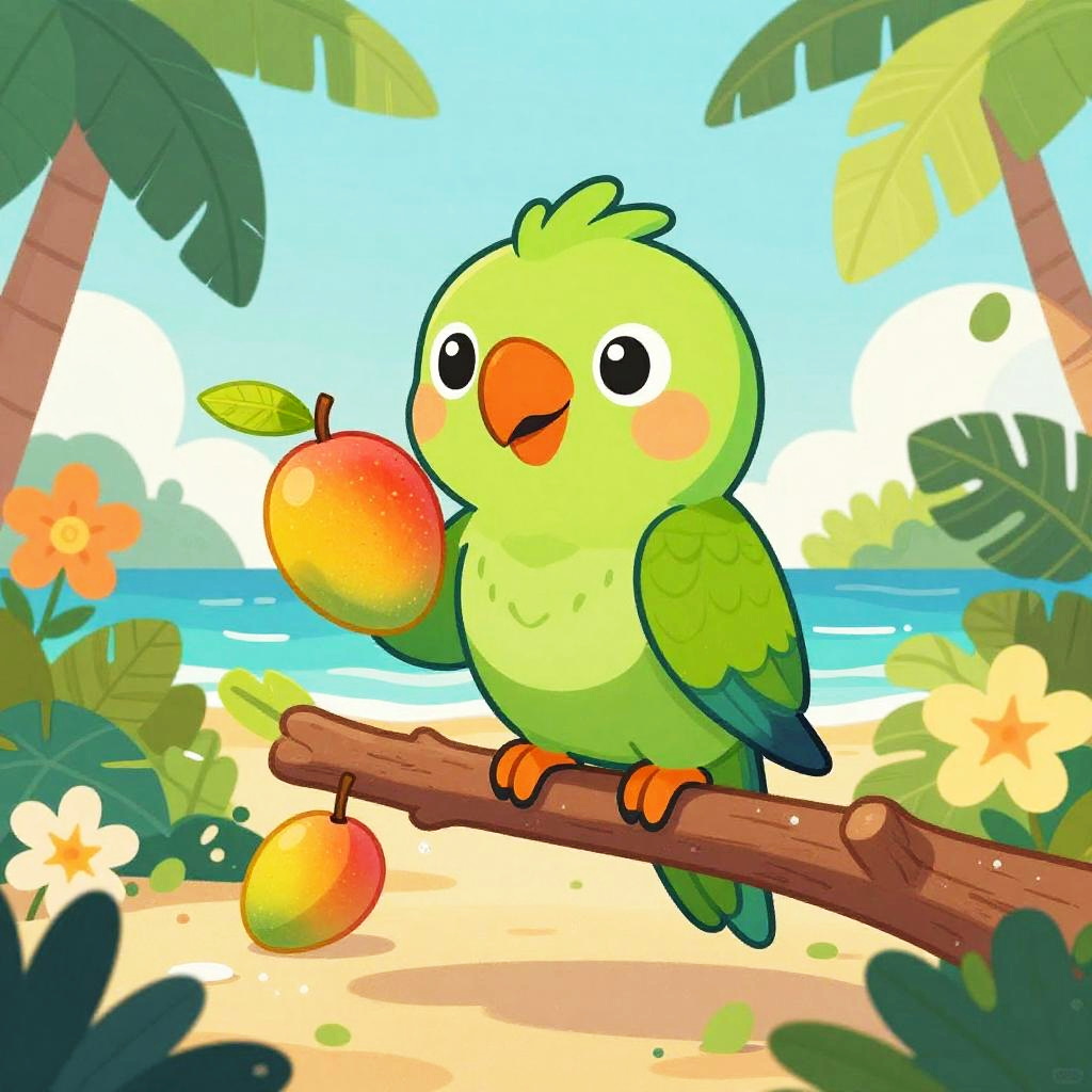 A chirpy cartoon tropical frog at lush rainforest floor strewn with colorful leaves, leaping between moss-covered stones in mid-jump. Bright, cheerful colors; playful vibe; bold outlines; soft glow; crisp edges; subtle highlights on wet sand; gentle sea breeze; balanced composition; high detail; clean, inviting summer mood.