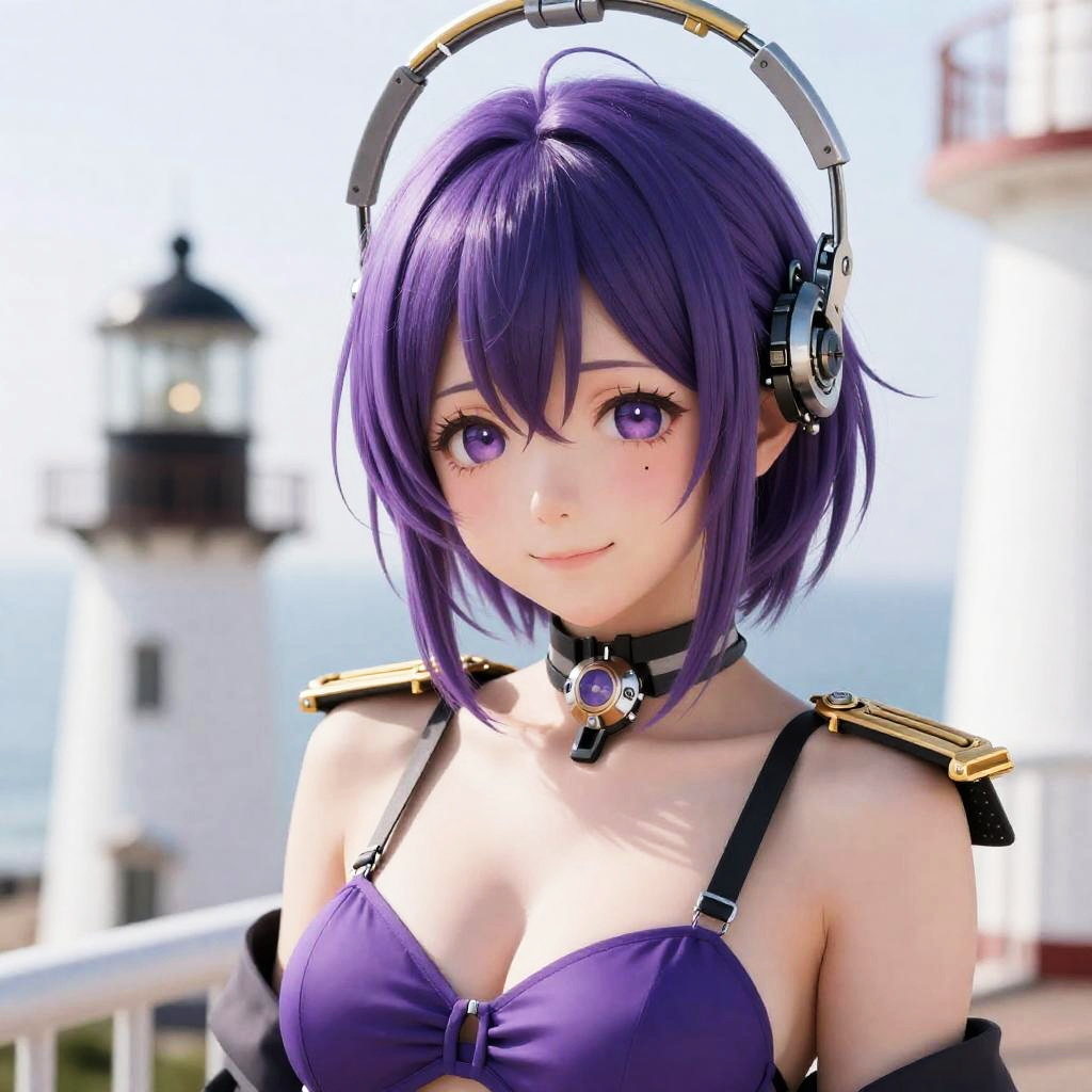 Upper body, admiral kancolle, 1girl, purple hair, short hair, purple eyes, smiling, blush, mole under eye, hair between eyes, purple panties, mechanical halo, collarbone, enigmatic, lighthouse balcony, soft morning light, ornate gold epaulette