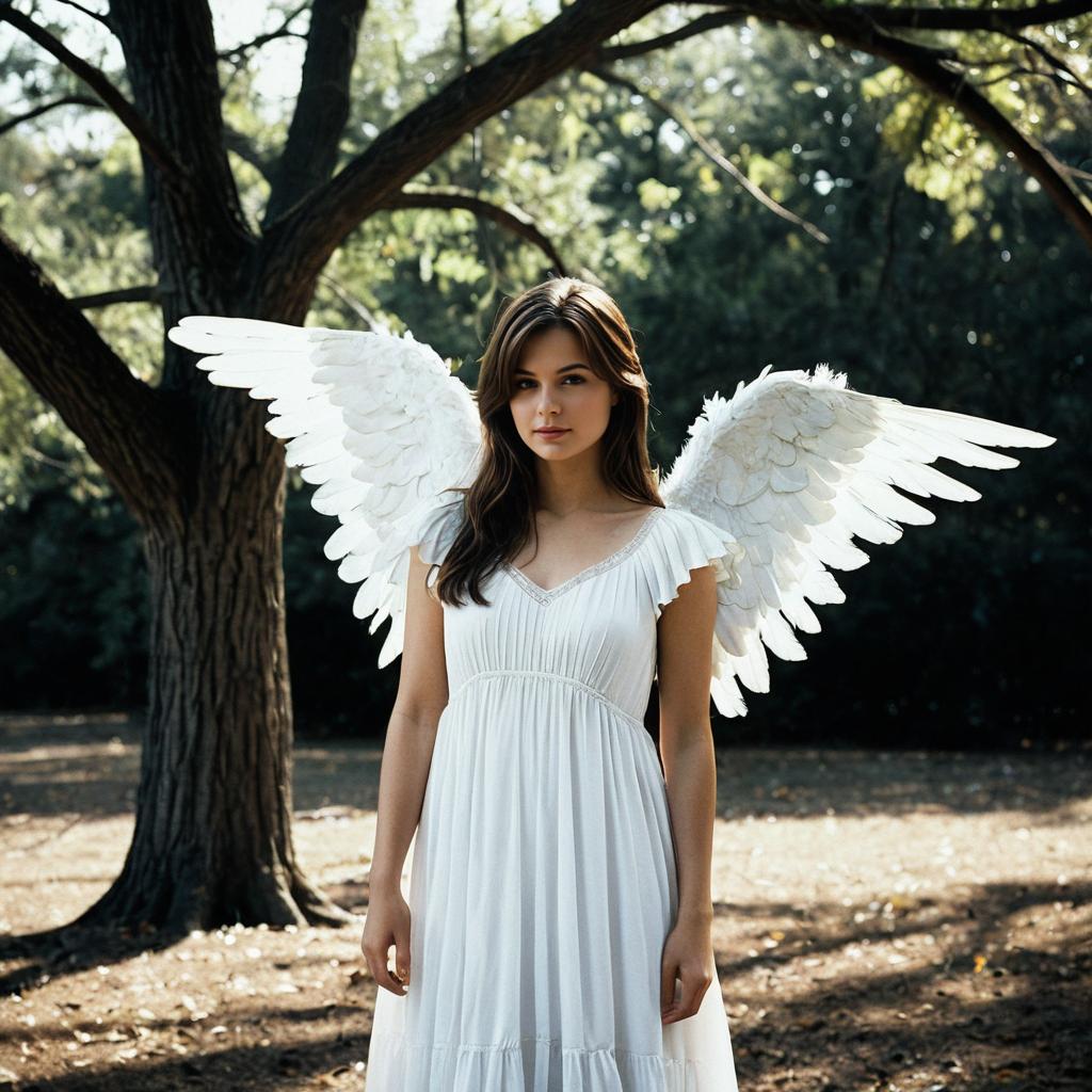 Portrait of a young woman wearing a flowing white dress and large feathered white angel wings. She has long brown hair and stands outdoors against a softly blurred natural background, looking directly at the camera with a calm expression.