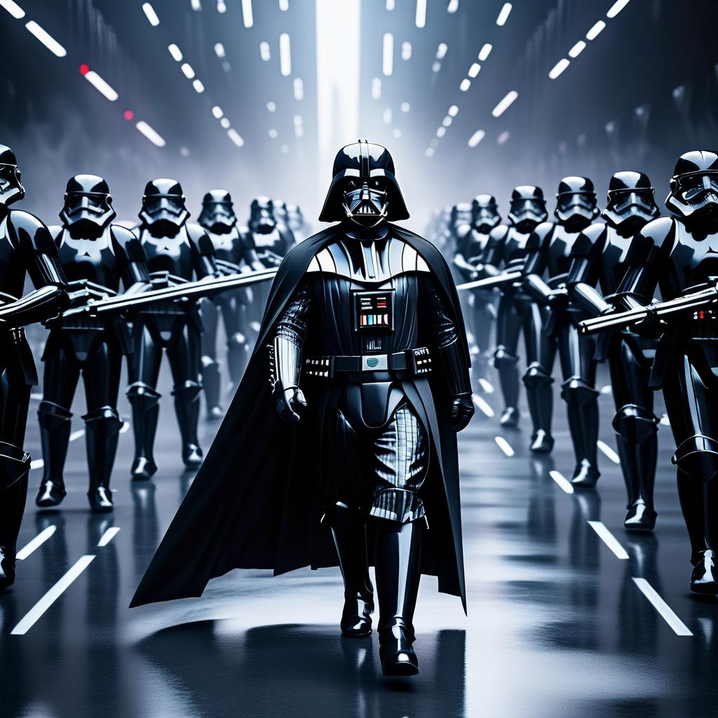 Darth Vader walking confidently at the forefront of a large battalion of stormtroopers in full battle armor. The scene features a cinematic and dramatic atmosphere with dark, reflective surfaces and foggy background, emphasizing a powerful and commanding presence.
