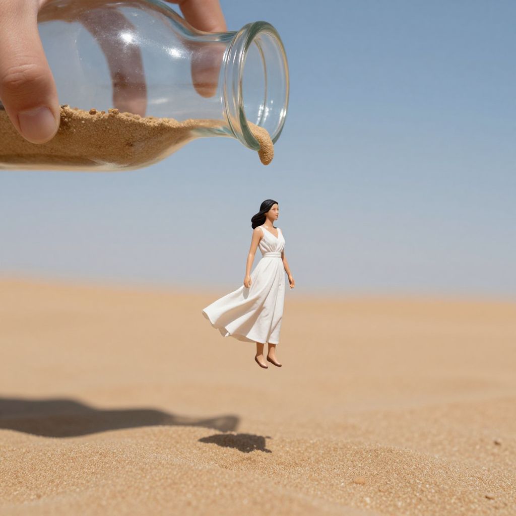 Photograph of a small woman in a white dress floating in a desert, with a hand pouring sand from a bottle above. Bright blue sky, clear
