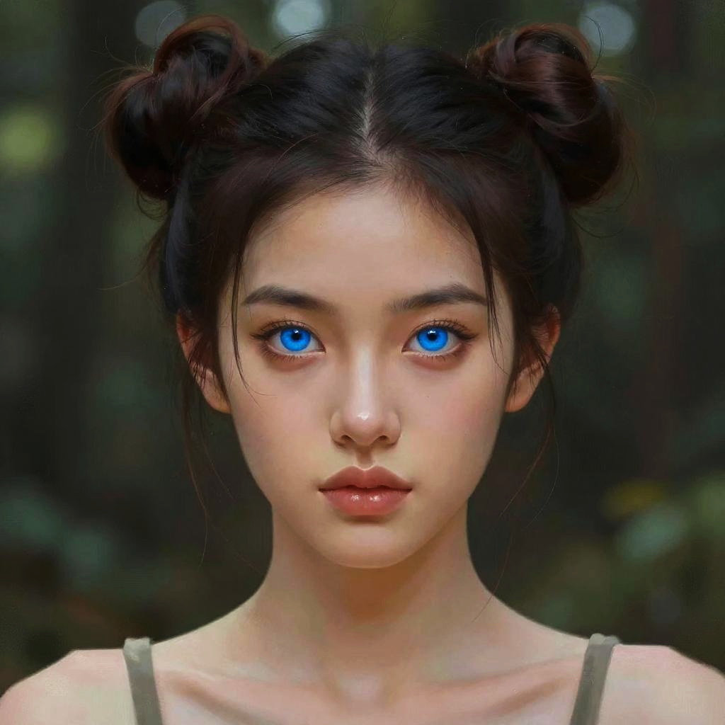 A digital portrait of a woman with striking blue eyes and dual bun hairstyle, set against a softly lit forest background. The artwork features vibrant colors and detailed shading in a stylized, semi-realistic digital painting style, capturing an intense and enigmatic expression.