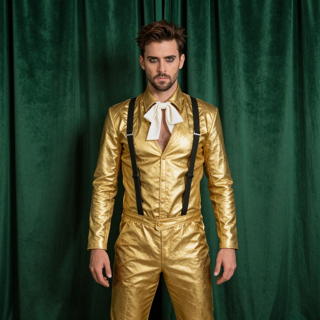 Photograph of a man with short brown hair and a trimmed beard, standing against a dark green velvet curtain. He wears a shiny, metallic gold suit with black suspenders and a white bow tie. The suit has a sleek, reflective texture and fits him well, highlighting his muscular build. His intense gaze is directed at the camera, and his arms rest casually by his sides. The overall style is fashionable and somewhat theatrical, with the green curtain providing a rich, contrasting background to the bright gold suit.