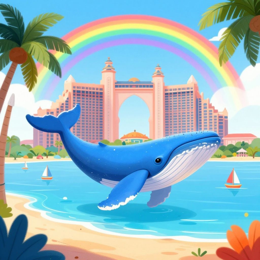 A vibrant surreal illustration featuring a large blue whale floating above a tropical beach with palm trees, colorful plants, and a calm ocean. The background includes a grand architectural building with dome towers and a multi-colored rainbow arching across the sky. Small sailboats are seen on the water, enhancing the fantasy coastal scene.