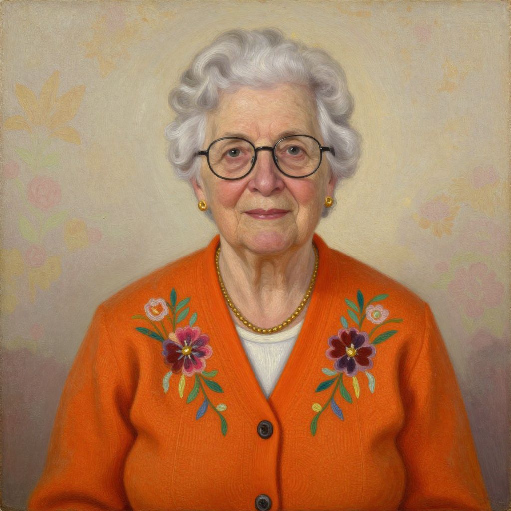 Photorealistic digital portrait of an elderly white woman with short, curly white hair, wearing black-framed glasses. She has fair skin and a gentle smile, dressed in an orange cardigan adorned with embroidered purple and white flowers on the shoulders. She also wears a gold necklace with a small pendant, gold earrings, and a white blouse underneath. The background is a soft, floral-patterned wallpaper. She is seated against a dark wooden chair. The image has a warm, slightly vintage feel, with subtle textures and gentle color gradients.