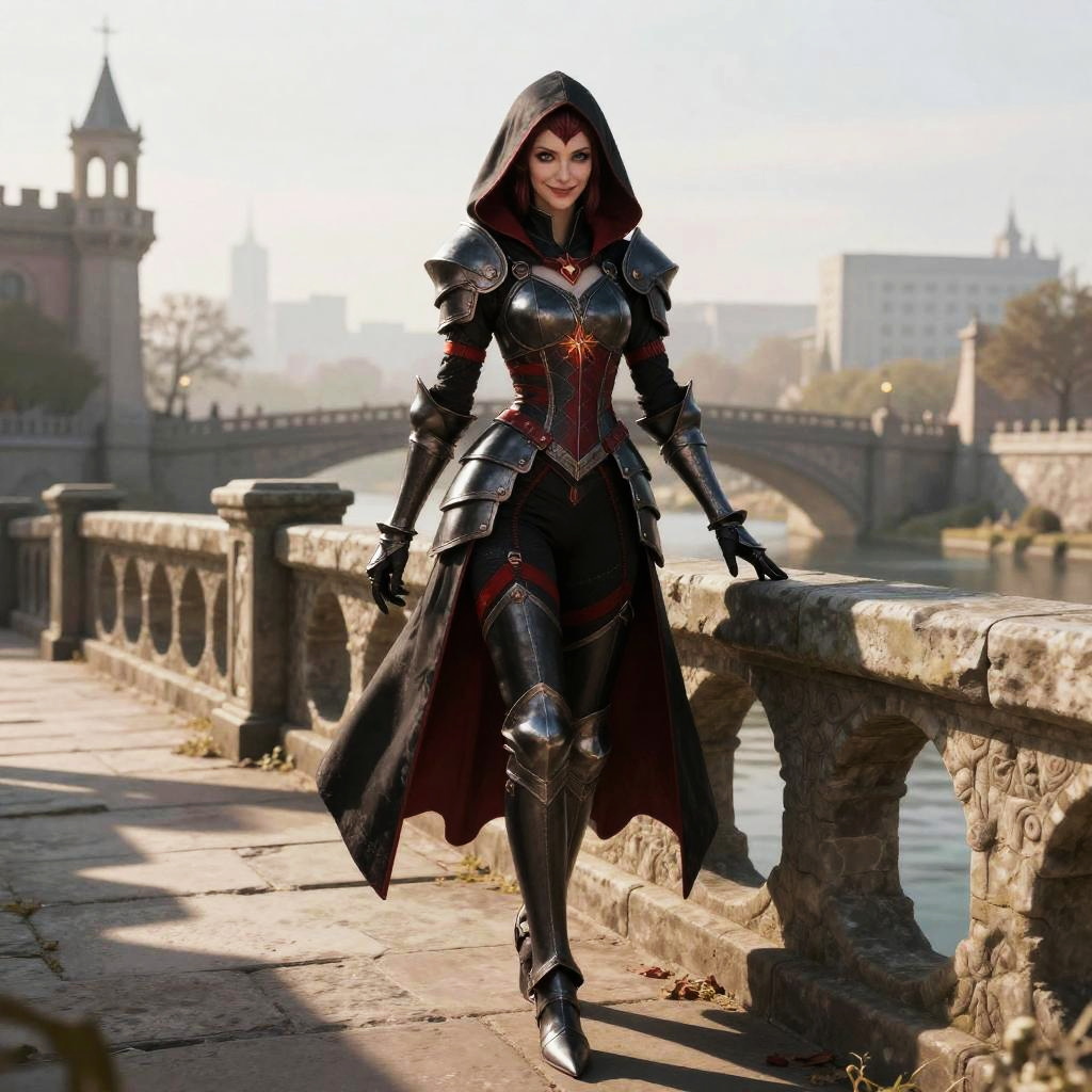 Queen rogue height, a slender rogue queen poised on an ancient stone bridge, with piercing eyes and a sly smile, wearing black and crimson armor, a hood partially obscuring her face, dawn light casting long shadows, fantasy digital art