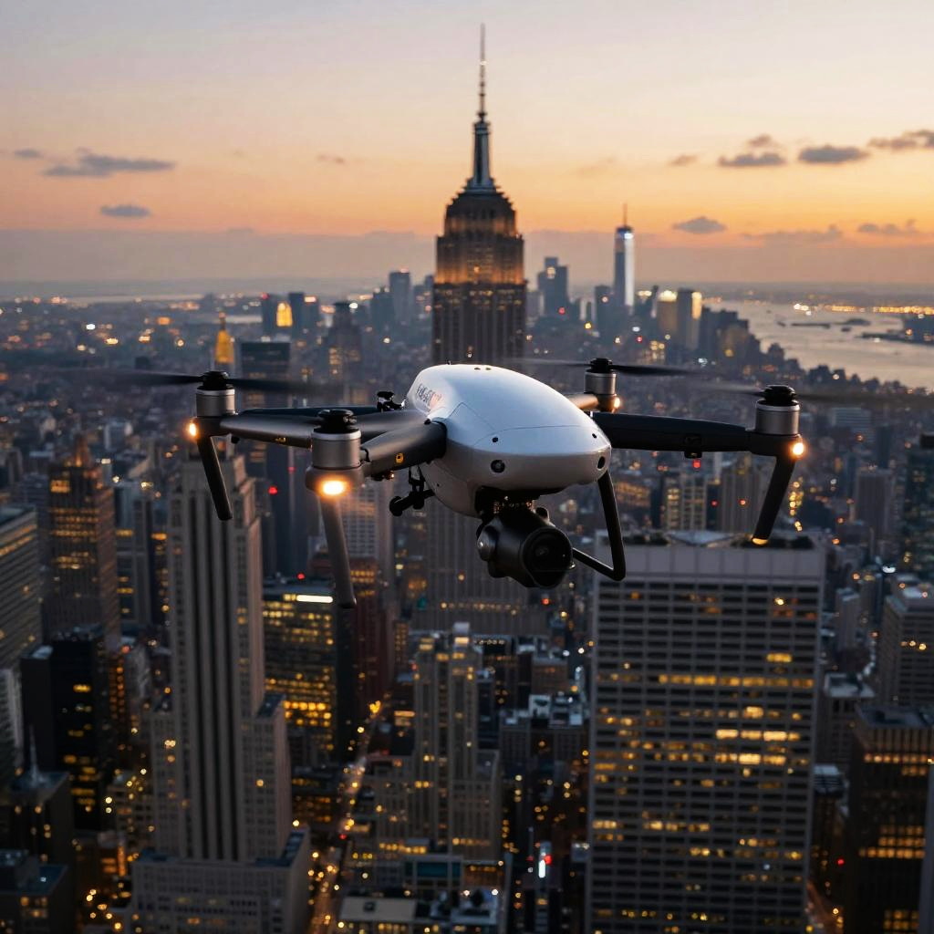 Nexar autonomous drone flying over metropolitan area, capturing high-definition aerial footage amid a crowded skyline, sunset hues blending with the glowing urban lights, intricate mechanical details and motion blur emphasizing rapid movement