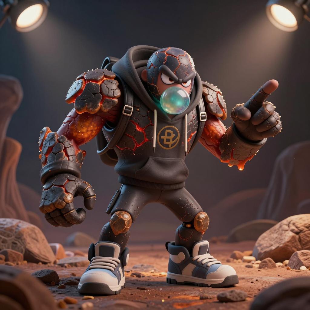 Highly detailed 3D render of an anthropomorphic soccer ball character with molten lava cracks and cooled rock armor body. The character wears a red explorer scarf and carries a brown satchel, displaying a determined and slightly grumpy expression. Posed crouched low, ready to spring in a school gymnasium setting with blurred sports equipment in the background, featuring dramatic rim lighting and strong shadows. The composition showcases a toy photography style with shallow depth of field and dynamic angles.