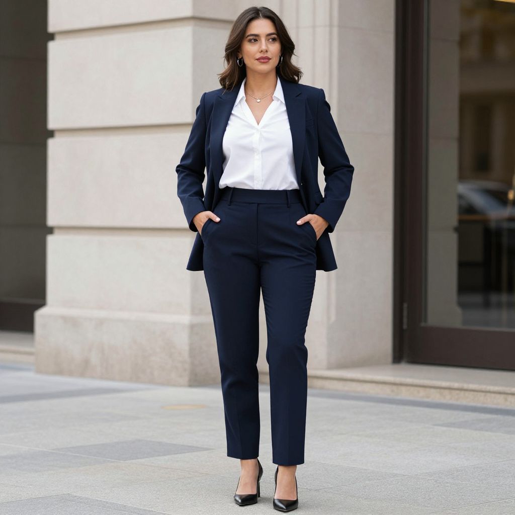 Tailored Woman Clothing Costume, woman in business attire standing outside of a building with her hands in her pockets