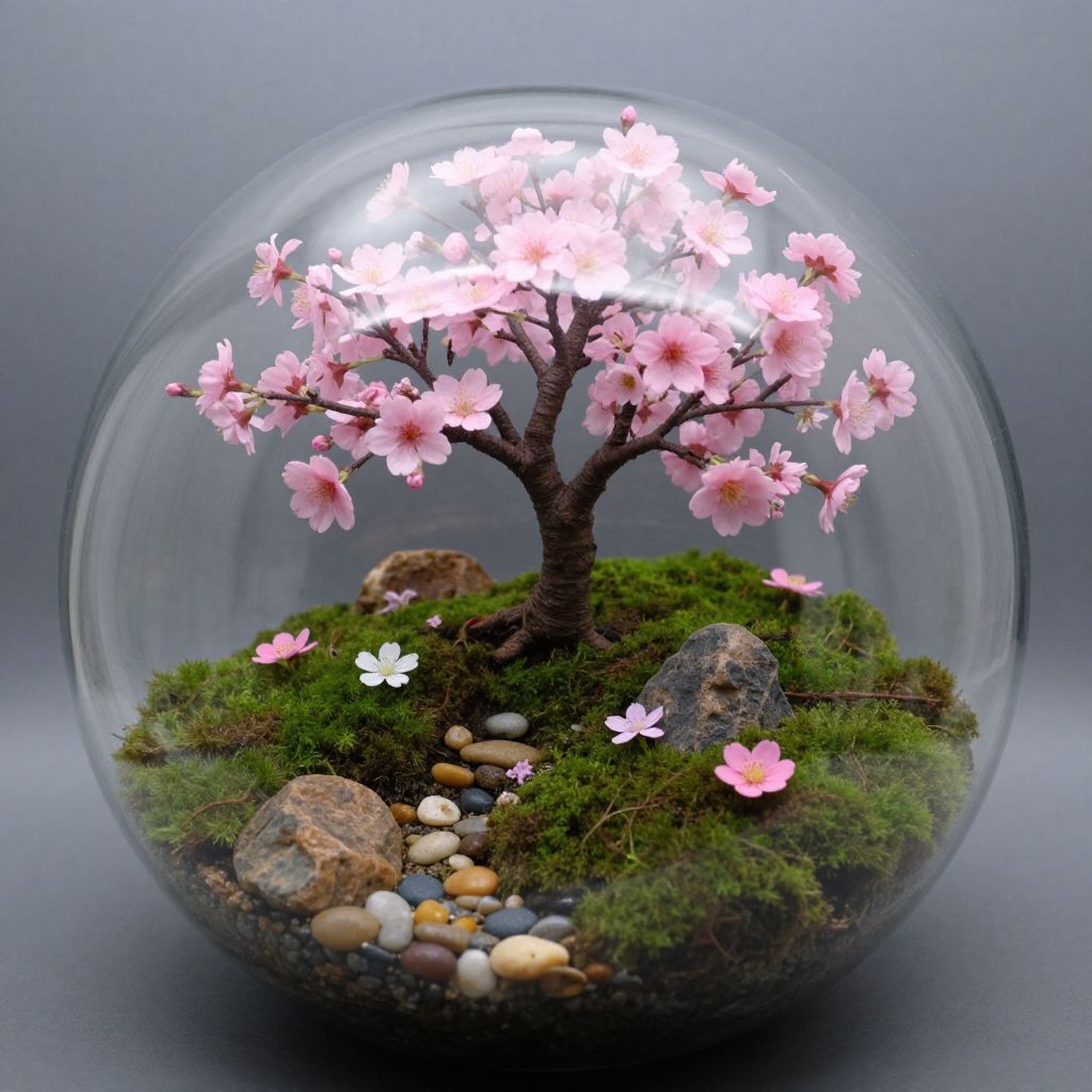 The image depicts a meticulously crafted moss terrarium, showcasing a captivating scene within a spherical glass container. At the heart of the terrarium is a striking cherry blossom tree, its branches adorned with vibrant pink flowers that extend gracefully into the surrounding environment. The tree is situated on a bed of lush green moss, which covers the base and extends outward, creating a natural and serene landscape. Scattered around the moss are small rocks and pebbles, adding texture and depth to the scene. Interspersed among the moss are delicate pink and white flowers, further enhancing the terrarium's beauty. The overall composition is harmonious, with the tree, moss, and flowers arranged in a balanced manner, creating a sense of tranquility and natural elegance. The glass container encloses this miniature world, allowing the viewer to appreciate the intricate details and the interplay of colors, textures, and shapes within the terrarium.