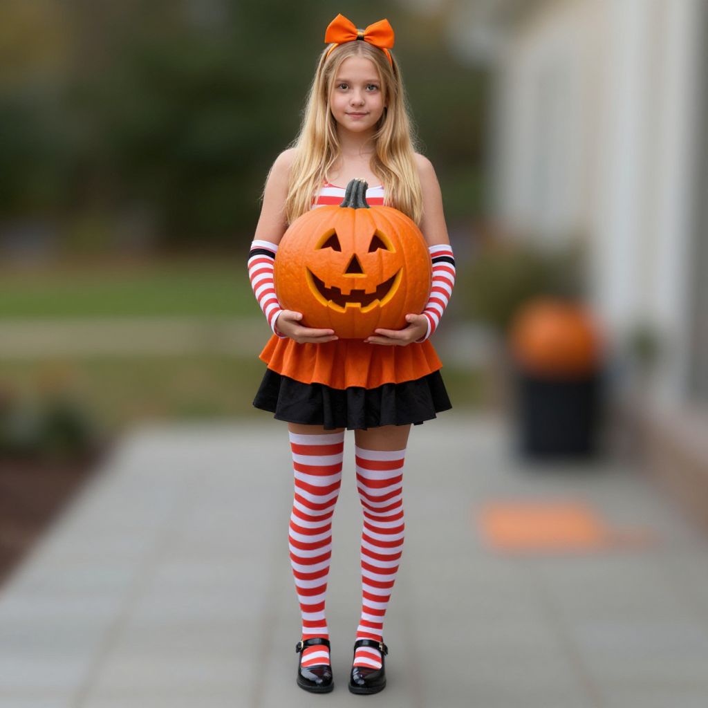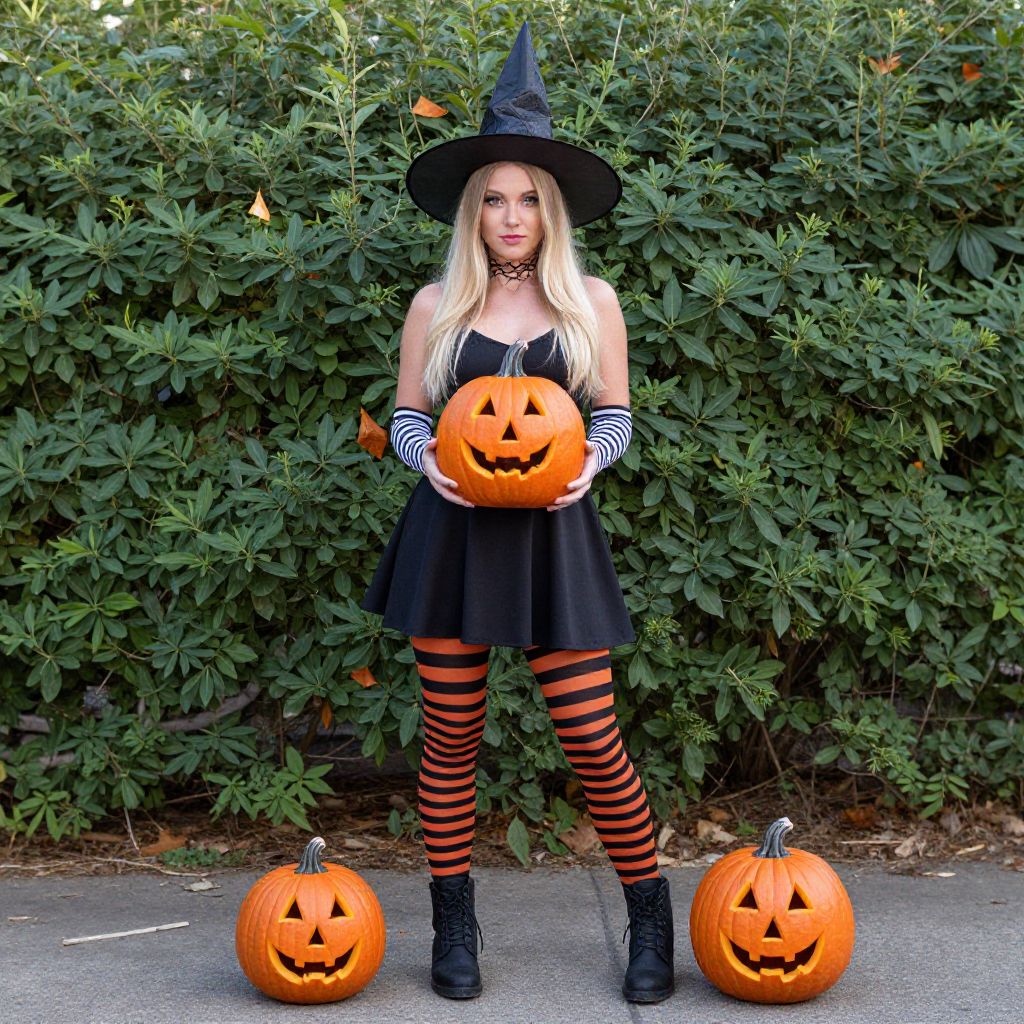 Photograph of a blonde woman in a black witch costume with a pointed hat, black and orange striped gloves, a black dress, and orange and black striped leggings. She holds a carved Jack-o'-lantern in front of her, standing on an asphalt path with three more carved pumpkins on the ground. She wears black boots and a black choker. The background features dense green foliage. Her makeup is dramatic with dark eyeliner. The image has a vibrant, festive Halloween theme.