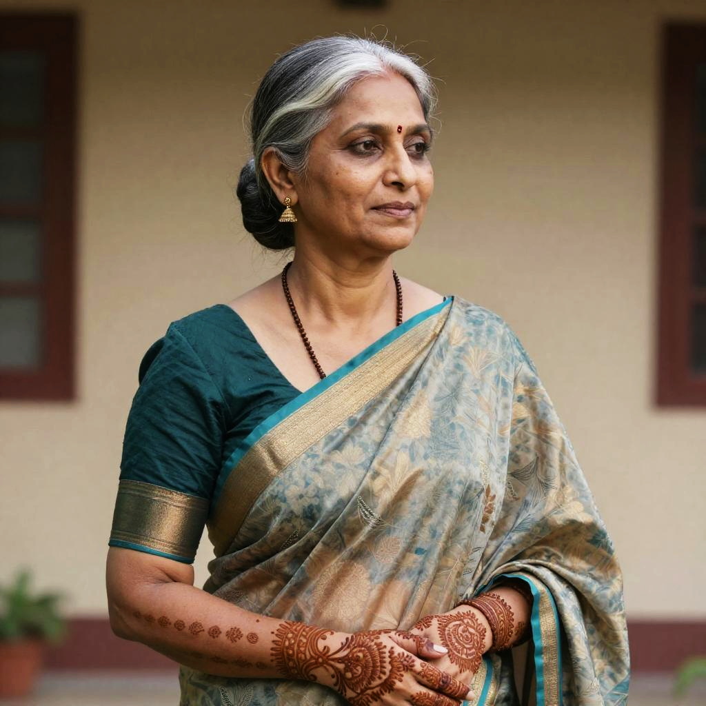 Portrait of mature Indian aunty with silver-streaked hair tied in a neat bun, draped in a silk saree, intricate henna designs on hands, peaceful expression, traditional Indian background
