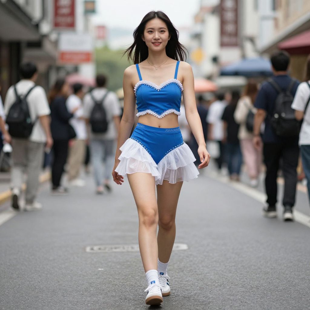 Photograph of an Asian woman with long black hair, wearing a blue crop top and white frilled mini skirt, walking confidently down a busy urban street