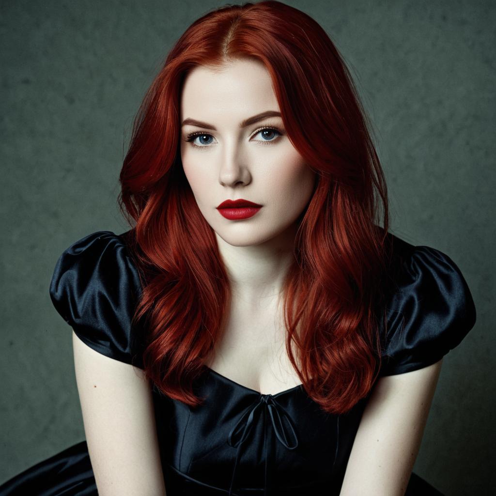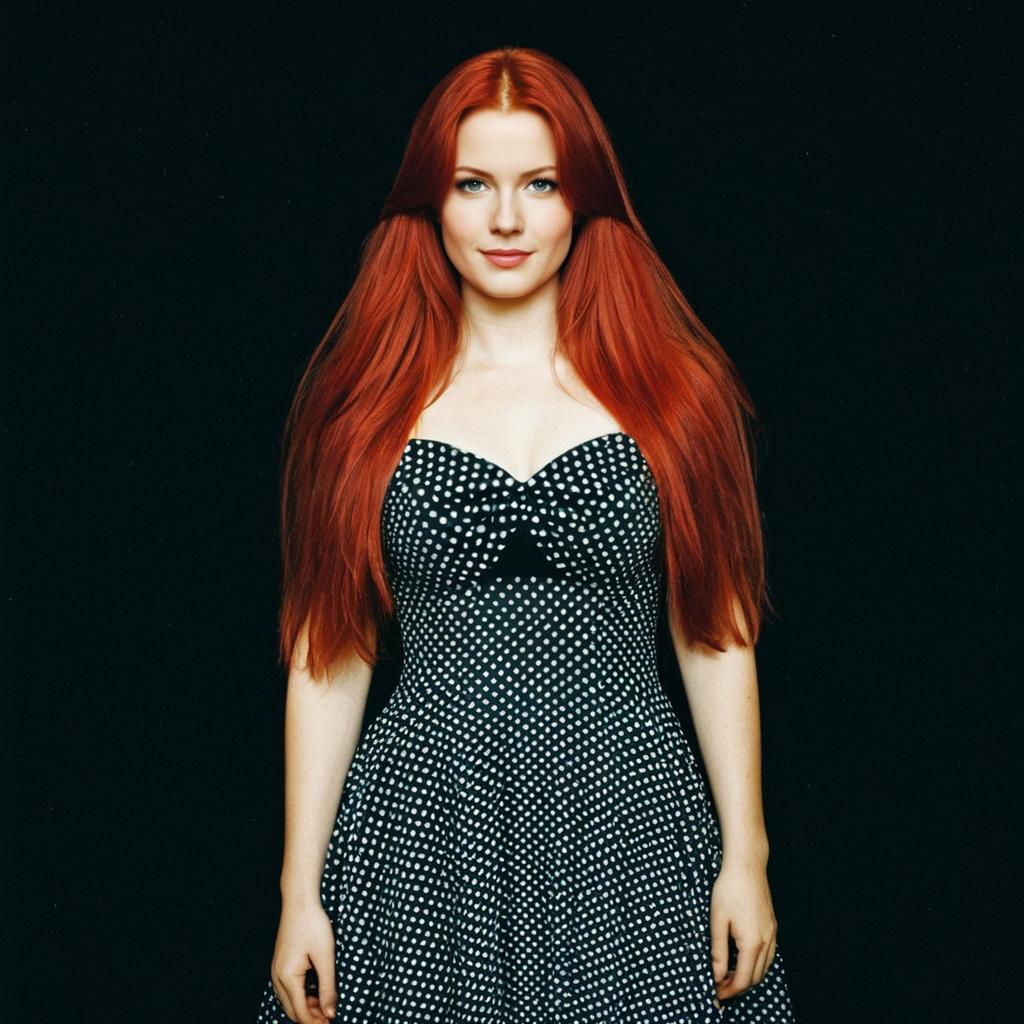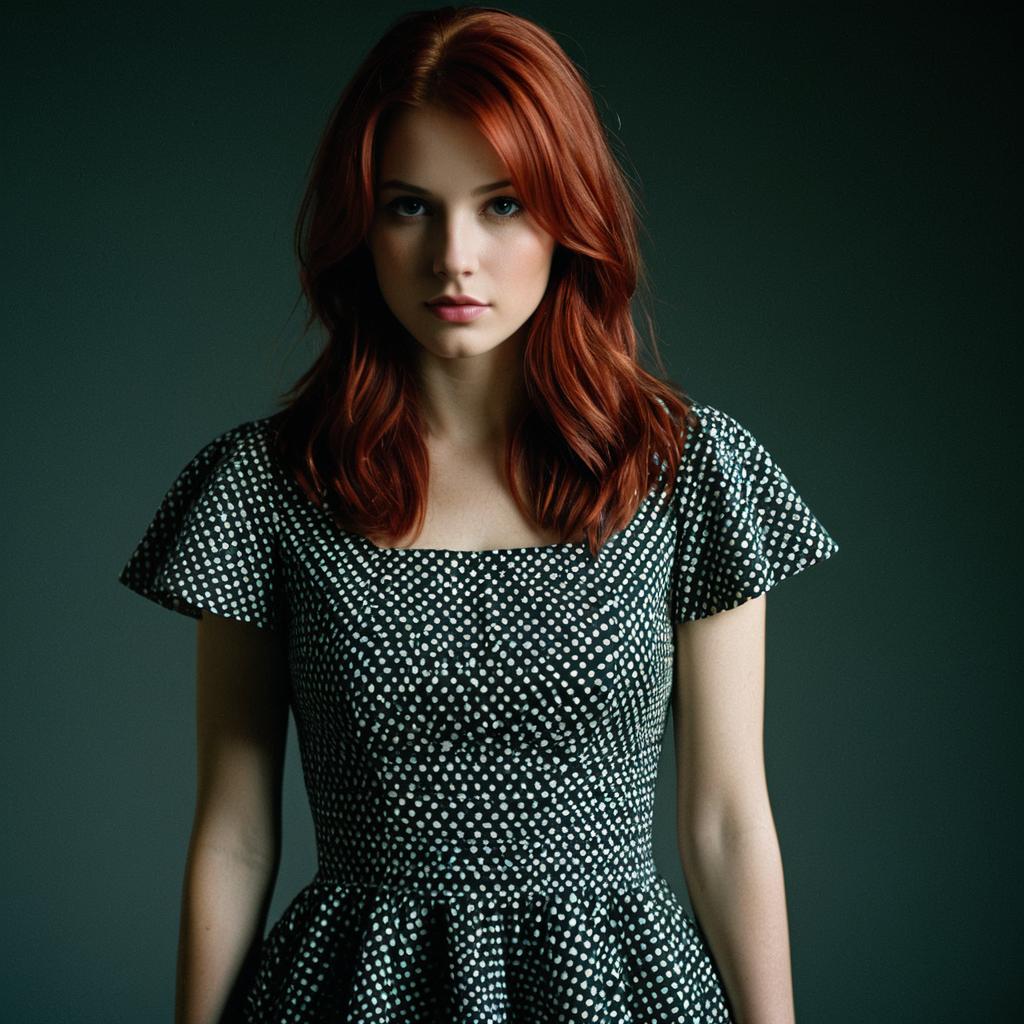 Portrait of a young woman with long red hair and freckles wearing a black speckled long sleeve shirt tucked into brown shorts with a decorative belt. She is also wearing black thigh-high stockings and standing against a plain background, looking confidently at the camera.