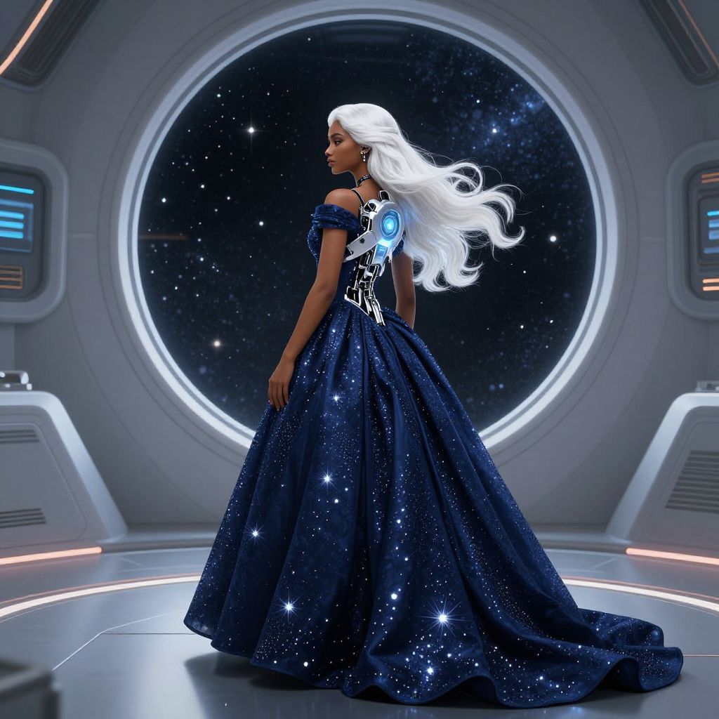 In this captivating illustration, a beautiful woman with light brown skin and long, flowing white hair stands gracefully inside a futuristic space station. She is adorned in a striking navy blue ballgown, its intricate design shimmering with a myriad of sparkling elements. The gown's back features a prominent robotic implant, glowing with a soft, ethereal light that contrasts with the cool, metallic textures of the implant. The space station's interior is a marvel of advanced technology, with sleek, curved walls and a large, circular window that frames a breathtaking view of the starry expanse beyond. The interplay of light and shadow, combined with the woman's elegant posture and the intricate details of her attire, creates a sense of depth and dimension within the scene.