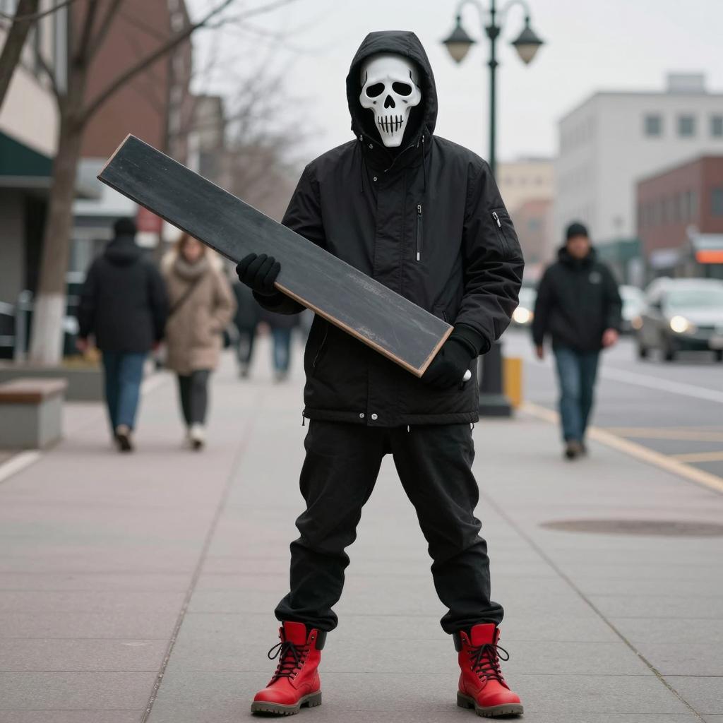 Hash slinging slasher, photograph of a person standing on a sidewalk, wearing a black hooded jacket, black pants, and red laced boots, with a white skull mask with black eye holes, holding a large rectangular object, urban background, people in the distance, daytime, street lamps, buildings, trees, winter, realistic style, high detail, natural light, full body, street setting