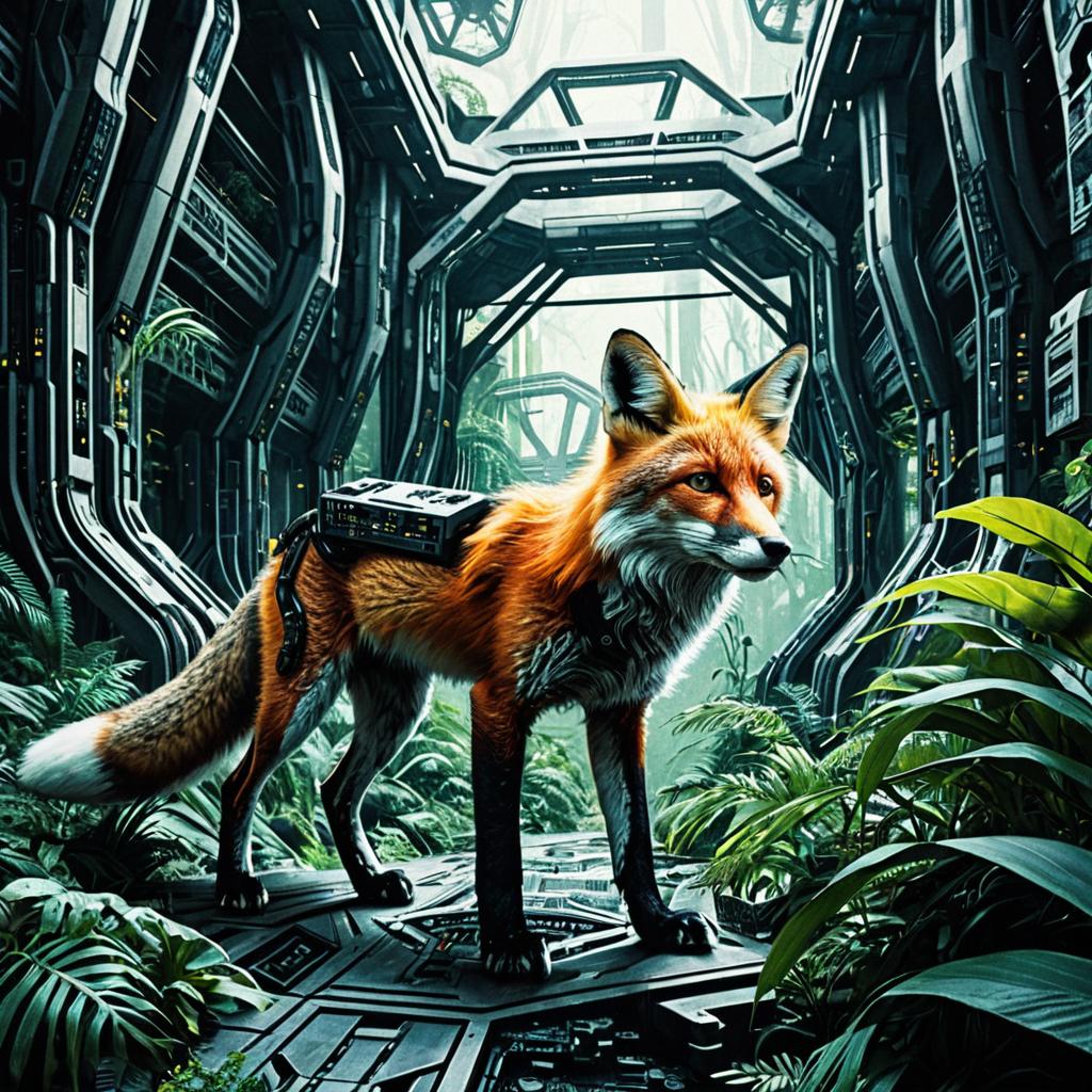 A cybernetic fox set against a digital jungle, capturing the essence of neo-futurism. This artwork draws inspiration from various artists, including Zaha Hadid and H.R. Giger.