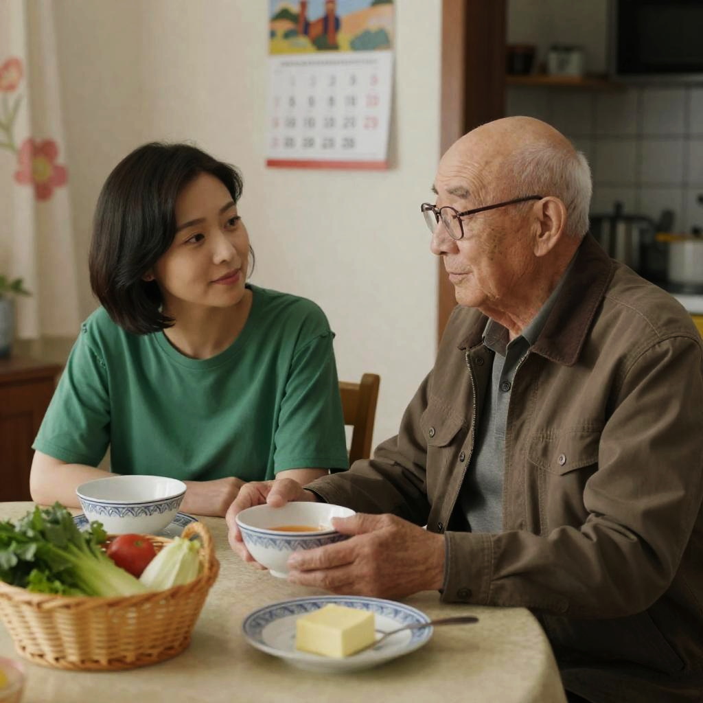 Photograph of four people in a rustic kitchen. A young woman with a red beanie and braided hair sits left, cooking. A man in a gray hat and coat sits center, stirring food. An older man in a dark hat and coat stands behind, smiling. Another older man with a blue hat and red shirt sits right. Wooden chairs and windows in the background. Warm lighting.