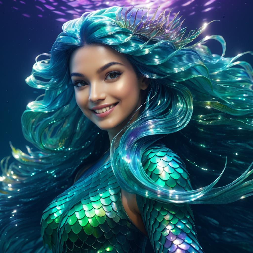 Portrait of a female mermaid with iridescent scales, with hair that flows like seaweed, smiling, fantasy CGI, inspired by The Little Mermaid.