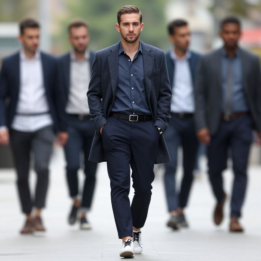 Man indie fashion costume, male focus, pants, facial hair, hands in pockets, outdoors, belt, blurry, jacket, 1boy, solo focus, shirt, blurry background, full body, street, multiple boys, walking, short hair