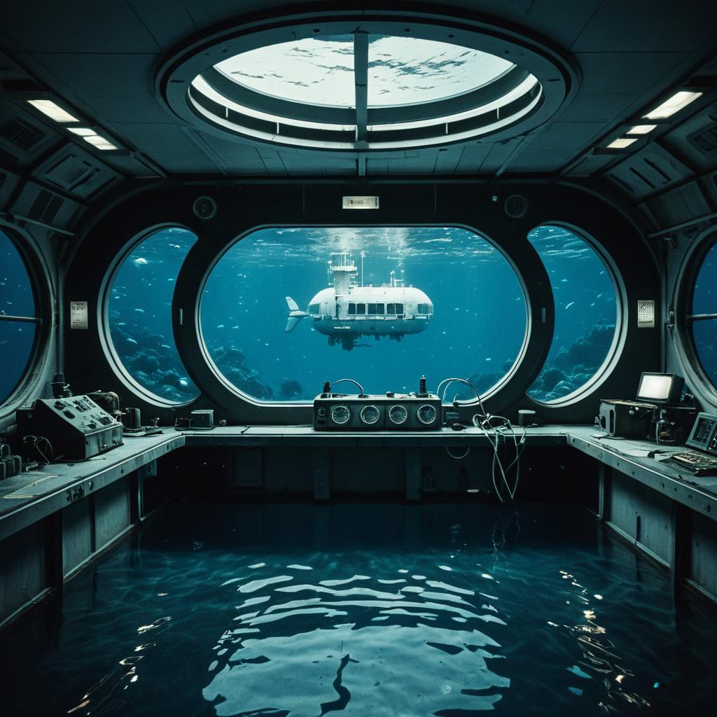 Mystical muted tones photograph of a floating underwater research station, showcasing the view under the moonpool window.