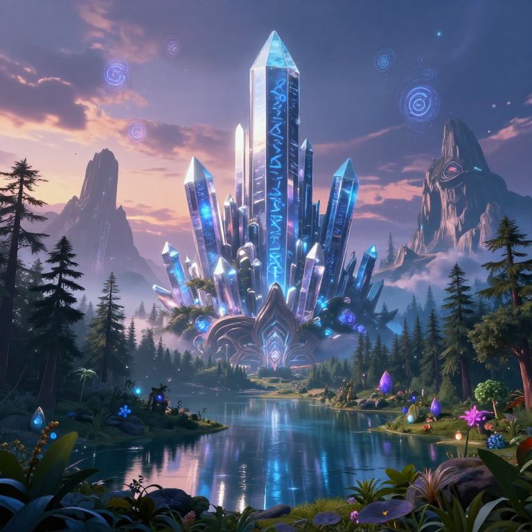 Wirdle fantasy landscape with towering crystalline structures glowing under a twilight sky, mysterious runes floating in the air, lush enchanted forests surrounding a serene lake, intricate details and vibrant hues blending surrealism and fantasy art styles.