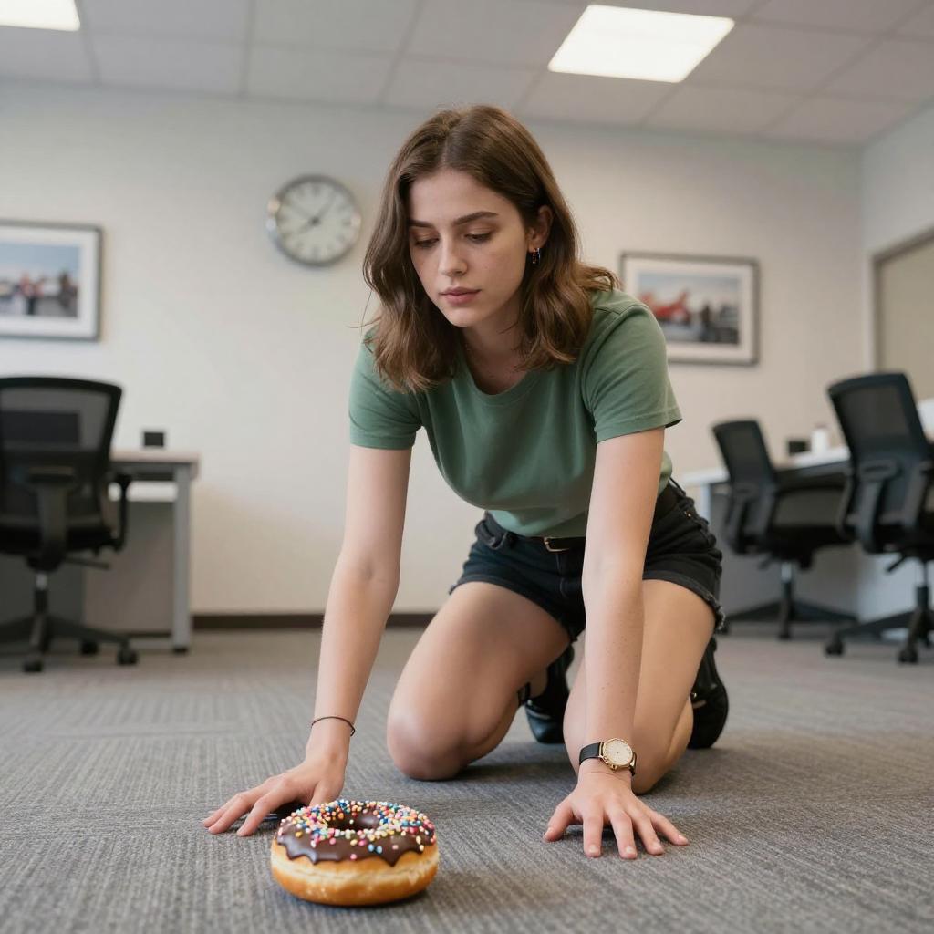 Photograph of a young woman with light skin and brown hair, kneeling on a gray carpet in an office-like room. She's wearing a green t-shirt and black shorts, stretching towards a chocolate-glazed donut with sprinkles in front of her. Her expression is focused, and the background includes a clock on the wall, framed pictures, and white ceiling tiles.