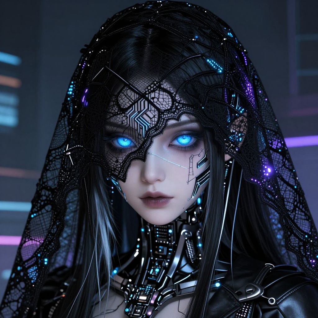 Digital art of a cyberpunk woman with glowing blue eyes, black lace veil, and intricate metallic face patterns, set against a dark, neon-lit
