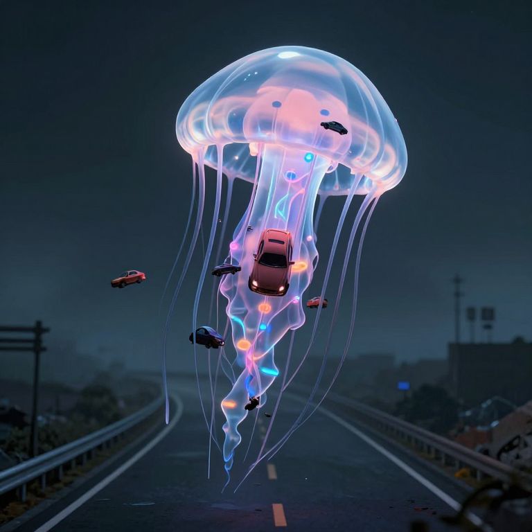 A surreal 3D-rendered scene depicts a colossal jellyfish hovering over a desolate highway, its translucent, computer-generated body housing tiny, suspended cars that evoke a hauntingly retro, cyberpunk aesthetic, blending digital artistry with atmospheric fog and dramatic lighting.