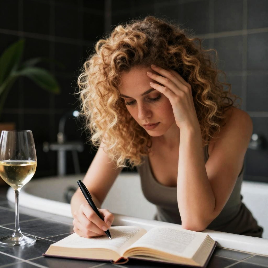 Young woman with wavy blonde hair, wearing a brown, ured long-sleeve shirt, lying on a sloped, wooden floor, writing in an open book with a pencil. Dimly lit, stone wall background. Light shines from the left, creating shadows. Soft blanket beneath her.