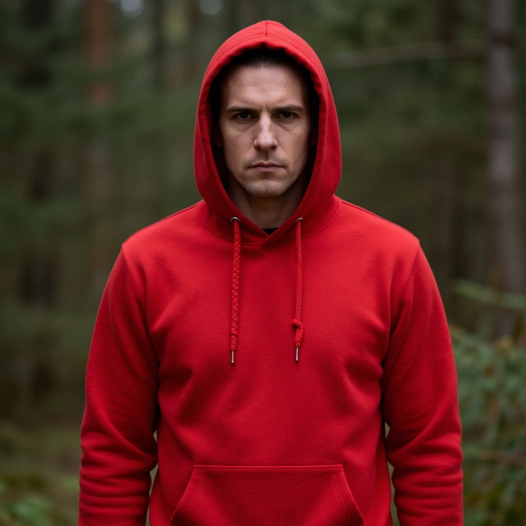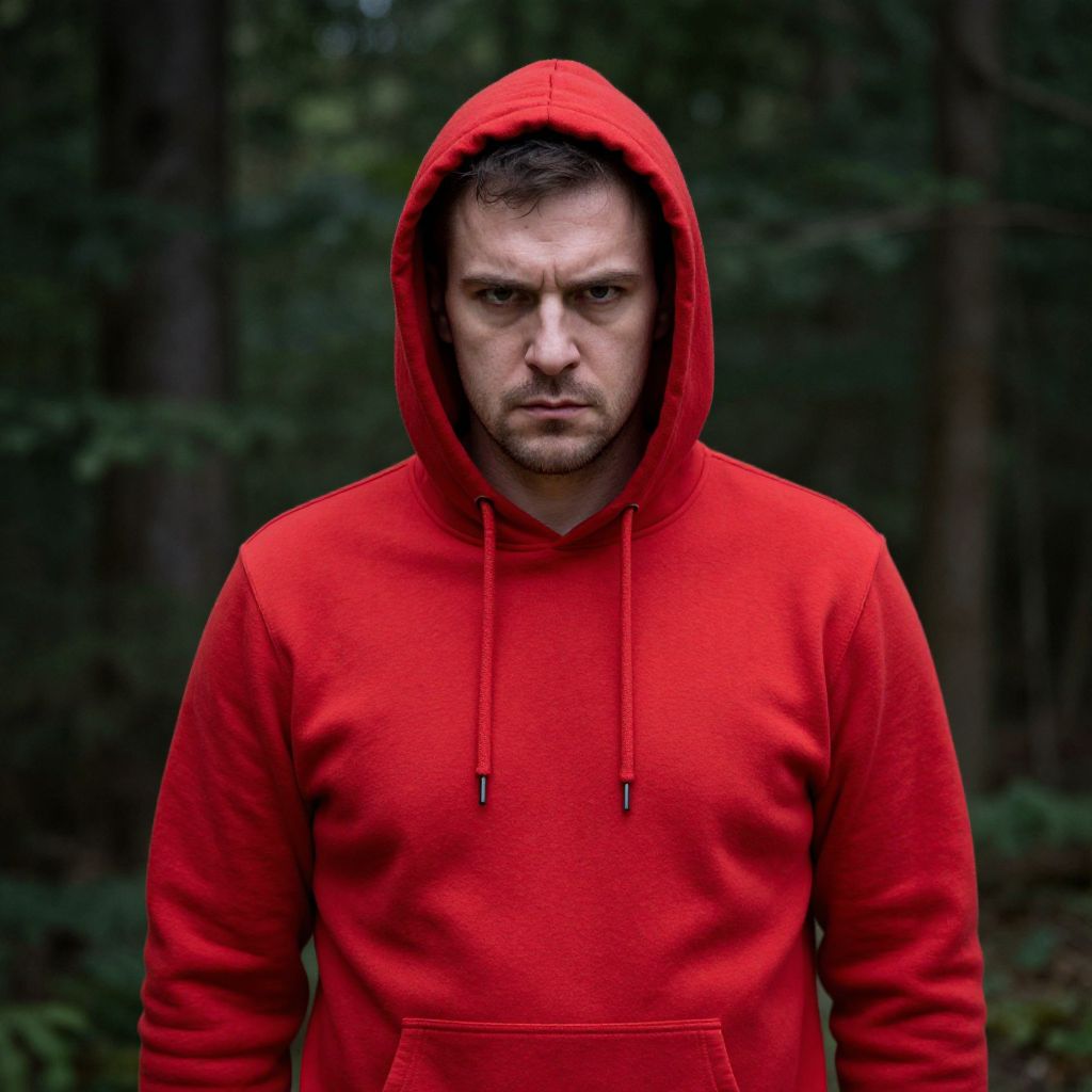 Photograph of a serious-looking man standing in a forest. He's wearing a bright red hoodie with the hood up, contrasting against the dark green, blurred background of trees. The hoodie has drawstrings and a pocket. His facial expression is intense, with a slight frown and focused eyes. The lighting is natural, highlighting the vivid red of his hoodie.
