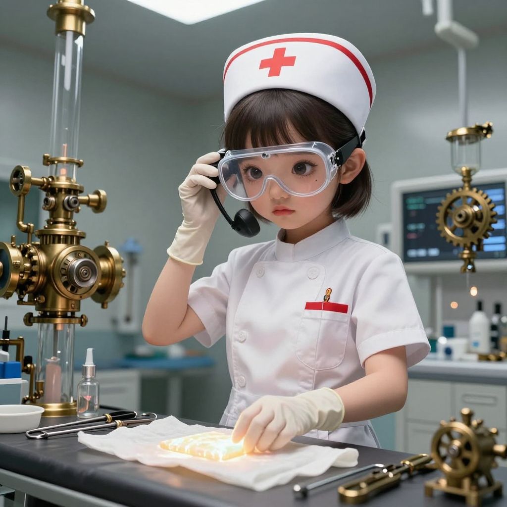Digital artwork of an Asian girl in a white nurse uniform and cap, wearing goggles, operating complex brass lab equipment in a sterile laboratory.