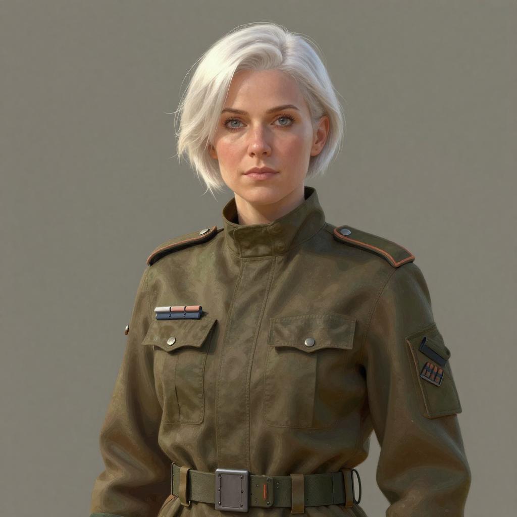 Portrait of a military engineer woman with short white hair, wearing overalls, medium shot, portrait, concept art, natural lighting, illustration, full color, highly detailed, photorealistic, by greg rutkowski, artstation