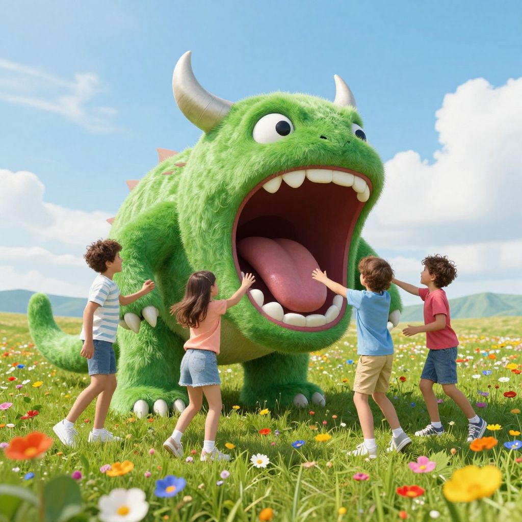 Children playfully interact with a colossal green monster with sharp horns and an enormous open mouth, as they stand amidst a vibrant meadow filled with colorful wildflowers under a bright, cloud-dotted sky.