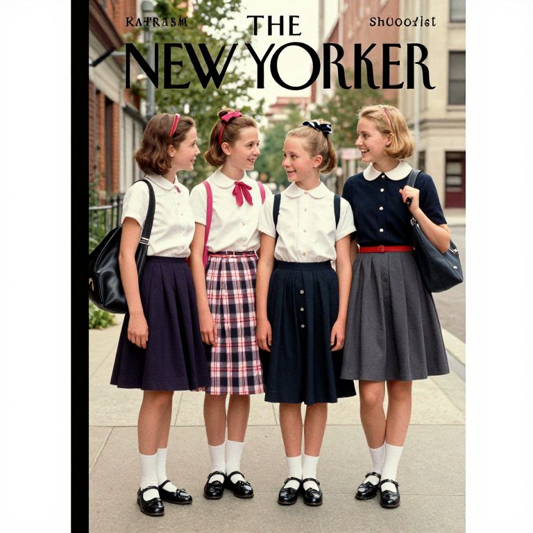 Photograph of four young girls in 1950s-style school uniforms, standing on a city sidewalk, smiling and chatting, with "The New Yorker