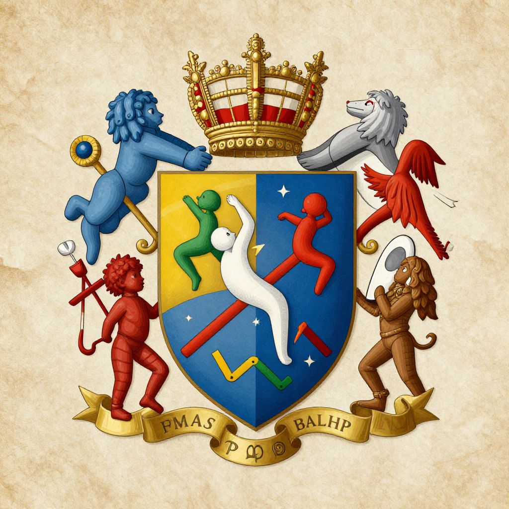 Creative personal coat of arms featuring intricate symbols of imagination and self-expression, vibrant colors merging abstract shapes with classic heraldic elements, set against a textured parchment background, detailed and elegant design.